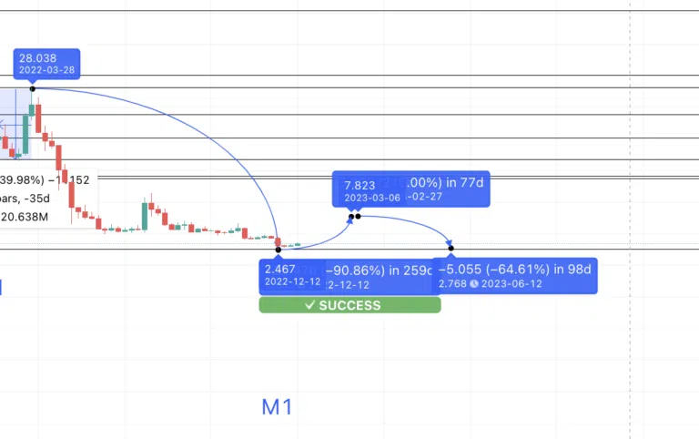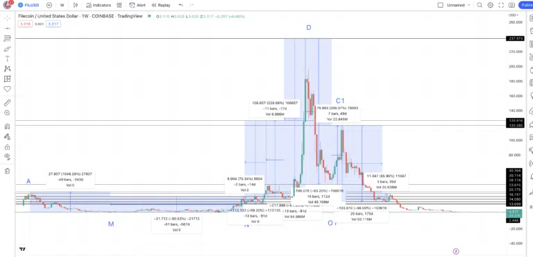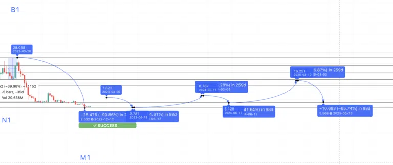 Par conséquent, le prochain creux, ou M1, pourrait être enregistré d’ici 117 jours avec une variation de 87,50 %. En traçant une ligne de prévision à partir de B1, on constate que la baisse la plus forte de Filecoin ne s’est pas produite aussi rapidement et qu’il a fallu 259 jours pour que le token perde 90,86 %. On peut donc en conclure que nos calculs vont dans la bonne direction.
