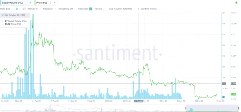 Vers fin octobre 2022, le volume social de FIL a légèrement augmenté, ce qui a donné un coup de fouet à son prix. Par conséquent, il est évident que les paramètres sociaux jouent un rôle clé dans l’évolution de la crypto FIL.