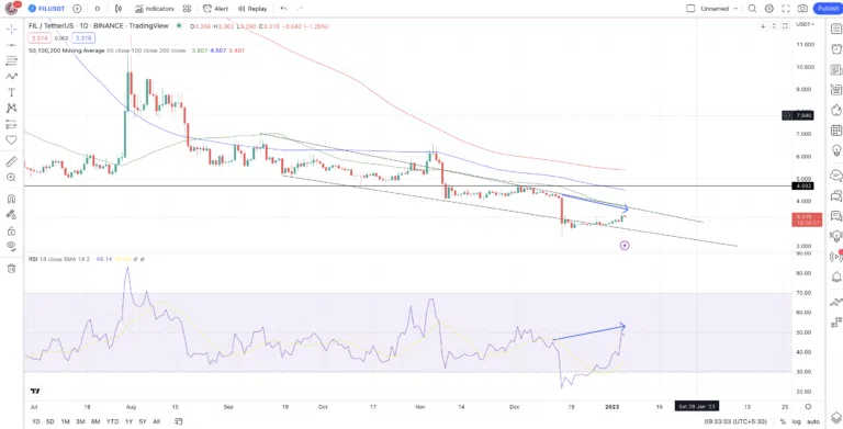 L’action du cours de FIL à court terme est plutôt positive. En effet, le token évolue au sein d’un schéma de biseau descendant et se rapproche lentement de la ligne de tendance supérieure. S’il parvient à dépasser cette ligne de tendance supérieure, FIL pourrait entamer un petit rallye haussier.
