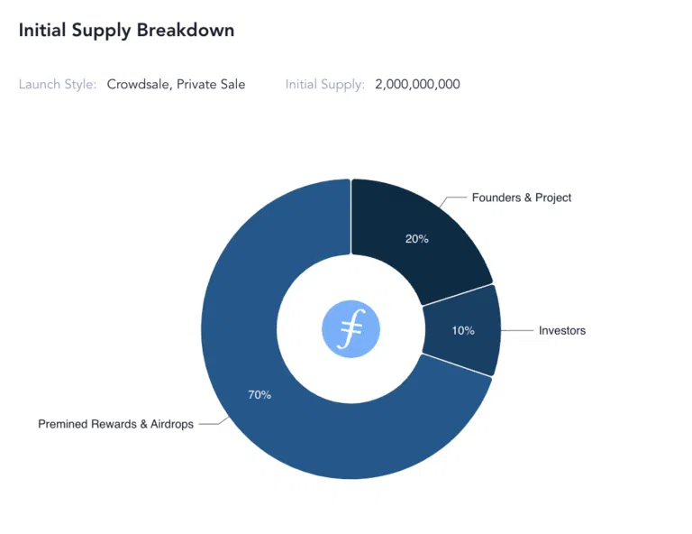 - Au fil du temps, 70 % de l’offre totale de FIL seront distribués aux mineurs et aux fournisseurs d’espace de stockage. 10 % ont été versés aux investisseurs, 20 % sont allés à la trésorerie du projet et 5 % ont été versés aux fondateurs avec une période de vesting de 6 ans.