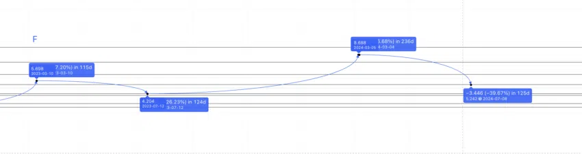 Selon les tableaux de données présentés, si nous marquons comme F le prochain sommet après E, il pourrait s’afficher à 5,698 $. Notez que F est toujours inférieur à E, ce qui signifie que l’APE, même en mars 2023, pourrait ne pas former un modèle de sommet supérieur. La chute du cours à partir de F pourrait mener à un creux de 57,92 % en 124 jours.