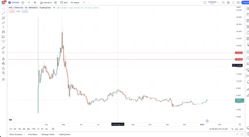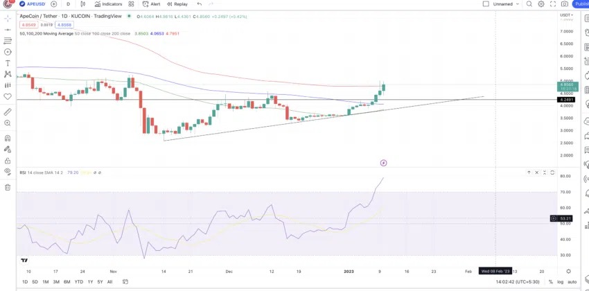 Ainsi, les calculs du schéma de prédiction du prix de l’ApeCoin 2023 suggèrent un sommet de 5,698 $ et un plancher de 4,20 $.