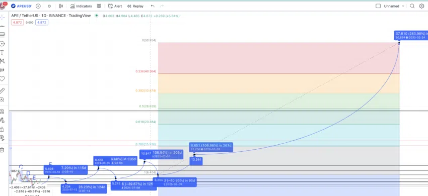 Si le cours suit le même parcours que de 2023 à 2026, le modèle de prédiction de l’ApeCoin pour 2030 peut mener à un sommet de 50,854 $.
