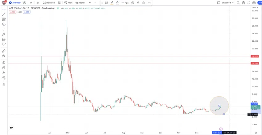 Début décembre 2022, même un volume social stable a fait grimper le cours de ApeCoin. De même, sachant que son service de staking a été lancé récemment, le prix pourrait continuer à grimper pendant un certain temps.
