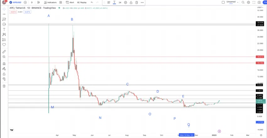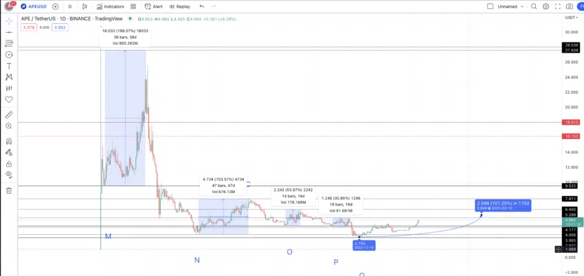 La distance jusqu’à ce sommet, cependant, peut atteindre 230 jours (des points M à E, 115 jours, et des points E à F, 115 jours), quoique cela dépende de l’état du marché crypto et de la croissance antérieure de l’ApeCoin.