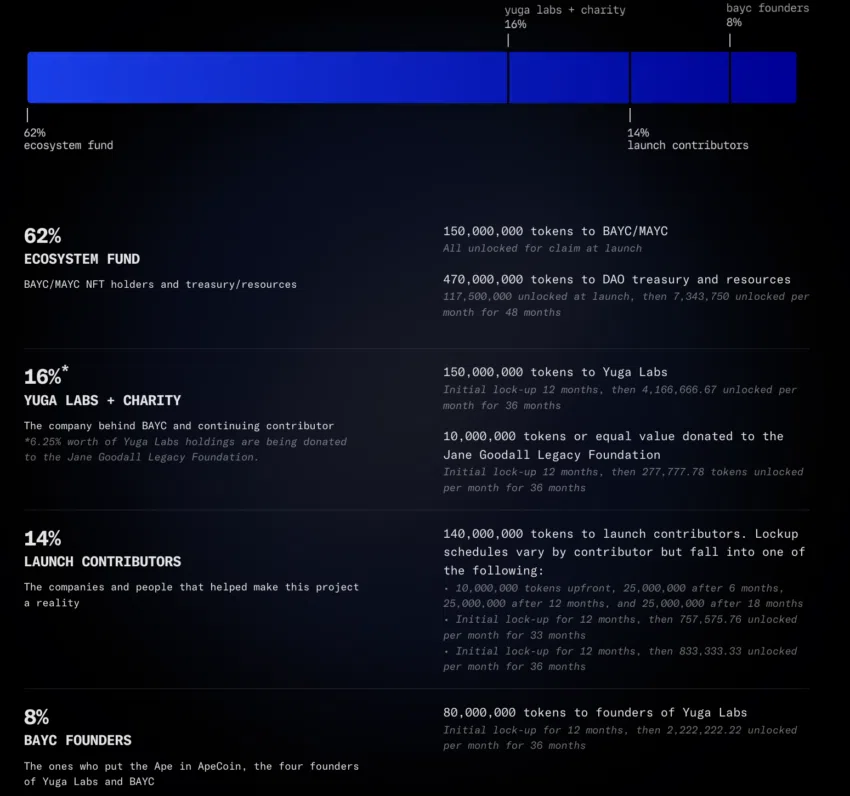 Si vous vous penchez sur les chiffres de distribution plus spécifiques, 62 % correspond à l’offre totale du fonds pour l’écosystème. Ces jetons sont débloqués au lancement et destinés aux détenteurs de NFT et à la trésorerie. Les 16 % restants vont à Yuga Labs et à des organismes de bienfaisance, mais avec une période d’acquisition initiale de 12 mois, puis une libération programmée s’étendant sur 36 mois.