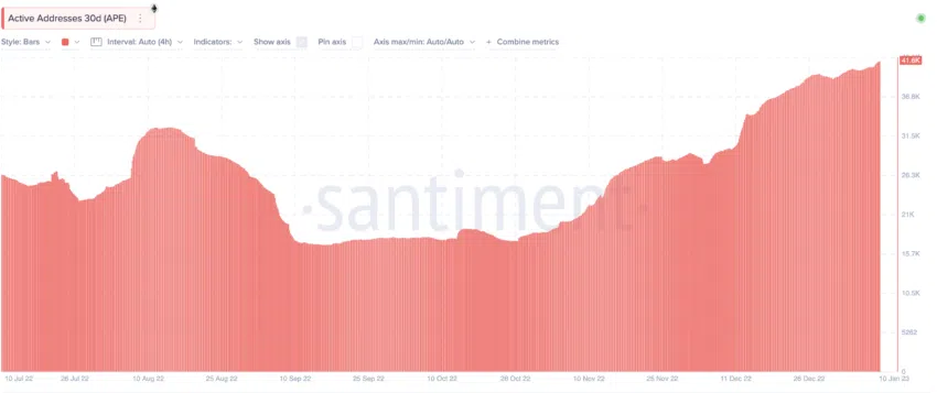 Si on se penche sur le nombre d’adresses actives, on constate une hausse du nombre de portefeuilles détenant des APE depuis juillet 2022. Cela témoigne d’un certain optimisme et pourrait donner le coup d’envoi de la prochaine étape d’un rallye de ApeCoin.