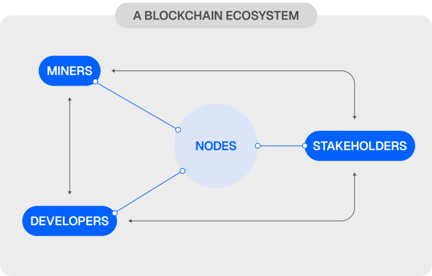 De son côté, chaque écosystème de blockchain compte plusieurs composantes clés qui assurent le bon fonctionnement du réseau :