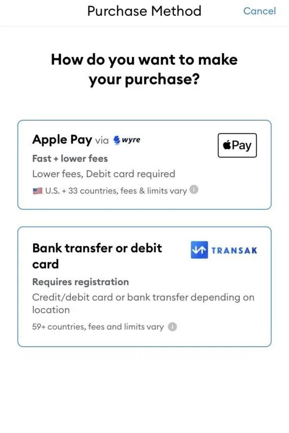 Une fois que vous avez terminé de vérifier et de configurer votre compte, vous devez déposer des ETH dans votre portefeuille. Ici, vous avez le choix entre un virement Wyre ou un achat par carte de crédit/débit.