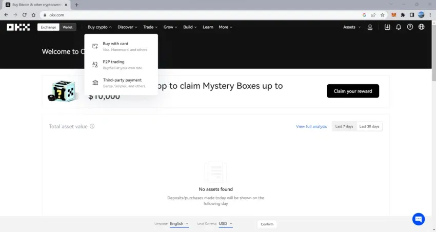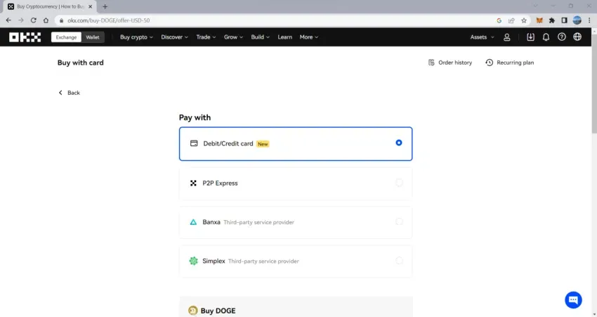 Une fois que vous avez configuré et vérifié votre compte OKX, connectez-vous à la plateforme. Cliquez sur l’onglet “Exchange” en haut à gauche de l’écran. Passez maintenant la souris sur l’onglet “Buy crypto” en haut de la page, et cliquez sur “Buy with card” (Acheter avec une carte).