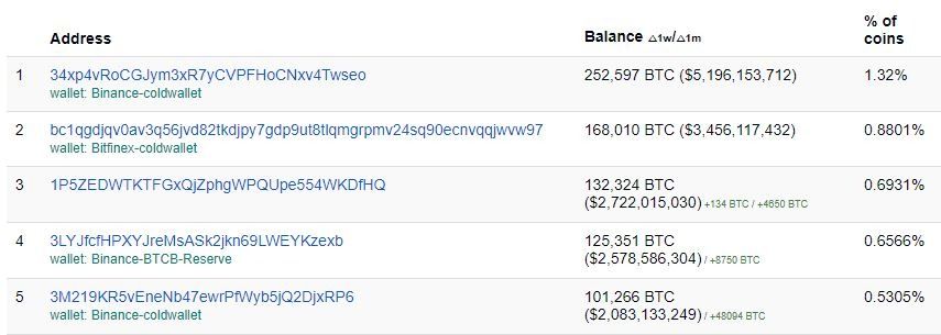 Comme on peut le voir sur l’image ci-dessous, trois des 5 premiers wallets Bitcoin appartiennent à Binance. Cependant, cela ne signifie pas nécessairement que Binance possède le plus de bitcoins, car une bonne partie des pièces qu’il détient appartient à ses clients.