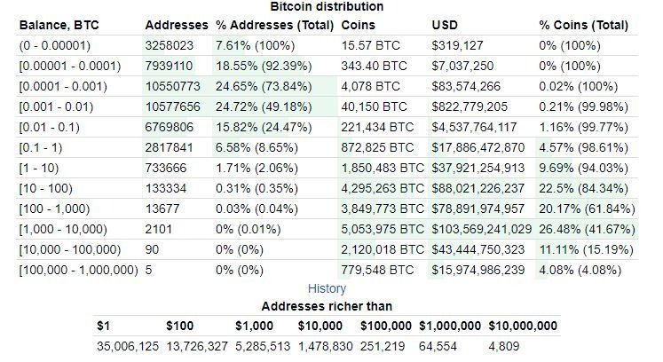 Actuellement, un peu plus de 19 millions de bitcoins (sur les 21 millions de l’offre maximale) ont été minés. Voici la distribution des pièces BTC :
