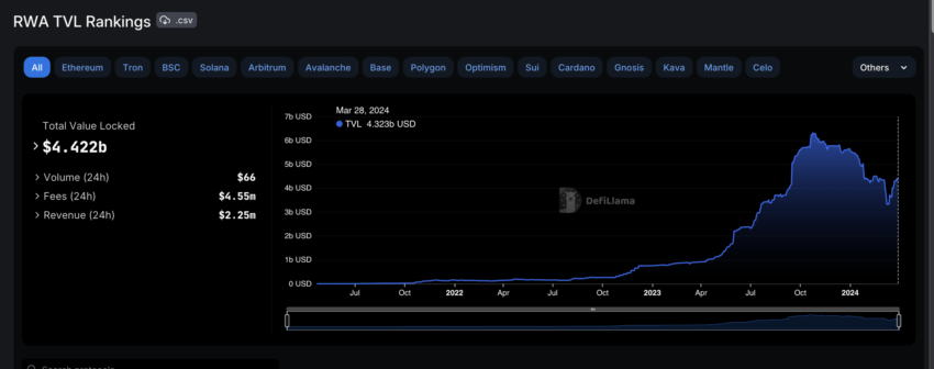 Selon les données de DefiLlama, le volume total bloqué (TVL) des “real-world asset tokens” s’élevait à plus de 4 milliards de dollars à la date du 29 mars 2024.