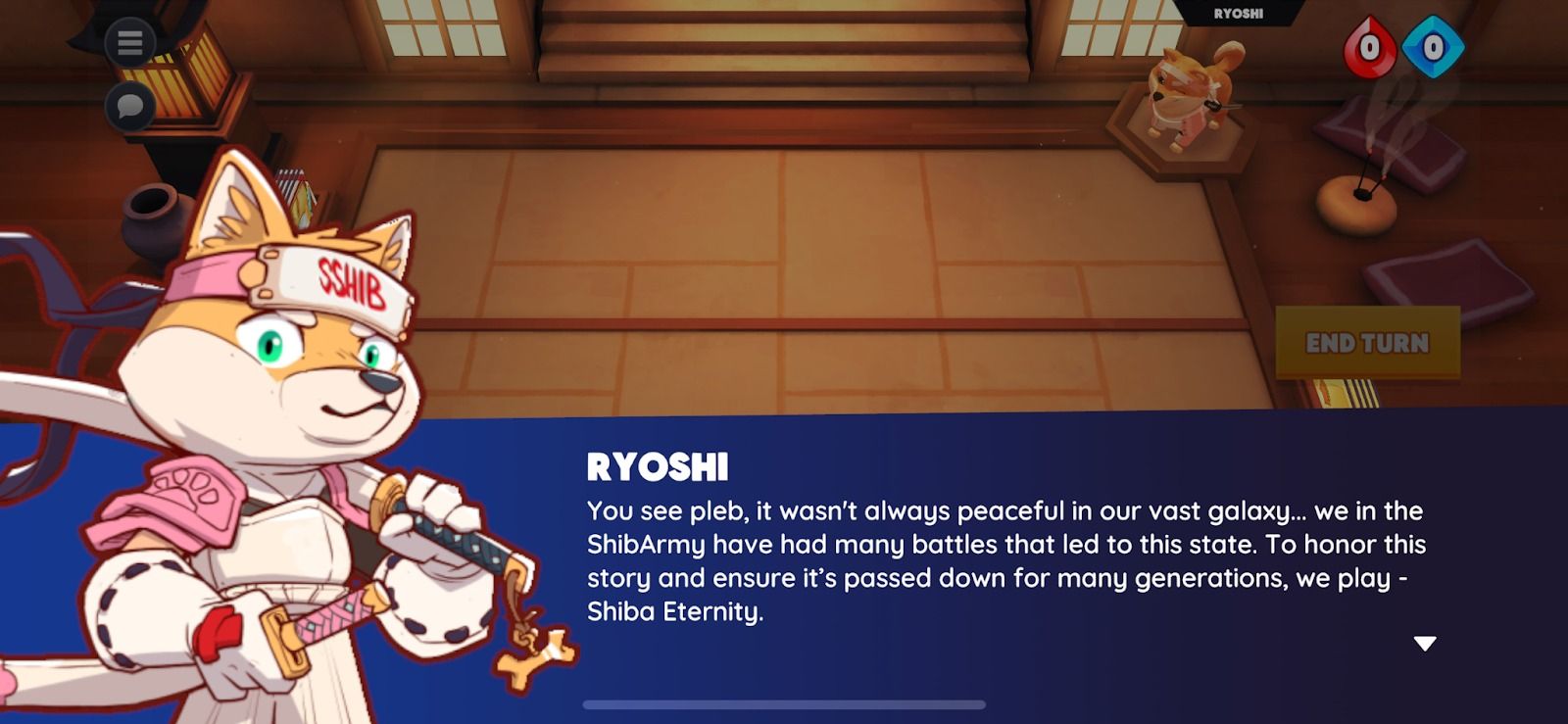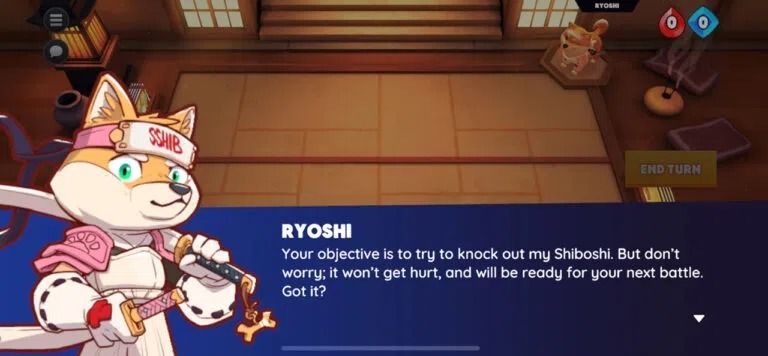 Ryoshi vous guidera tout au long de votre premier combat. En effet, le jeu d’introduction a pour objectif de vous faire découvrir tous les aspects de Shiba Eternity, notamment le jeu de cartes, le dojo, etc. Au cours de cette première partie, vous vous familiariserez avec les différents mécanismes du jeu.