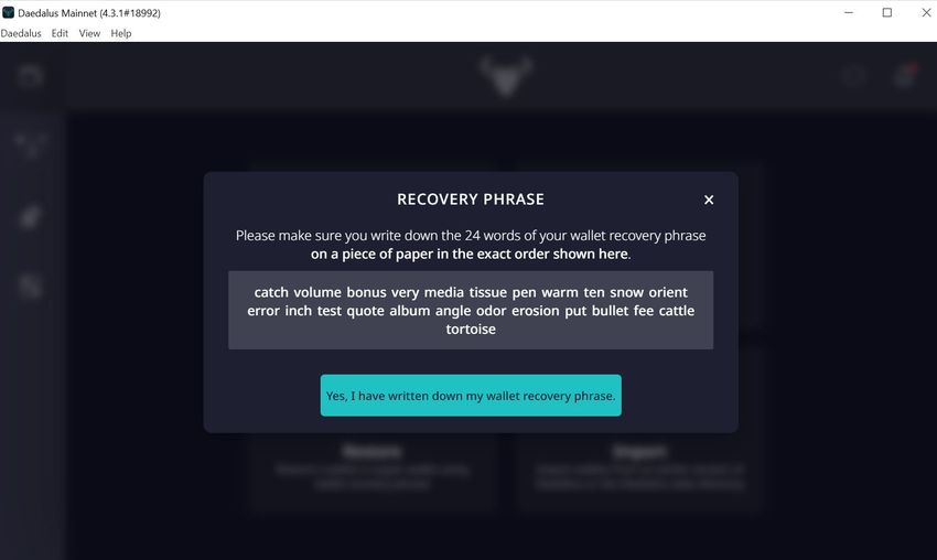 Comme pour le portefeuille Yoroi, vous devrez installer Daedalus sur votre appareil. Les étapes sont similaires à celles de Yoroi. Assurez-vous de conserver en toute sûreté votre phrase de passe de récupération, dont vous aurez besoin pour récupérer votre portefeuille au cas où quelque chose arriverait à votre appareil.