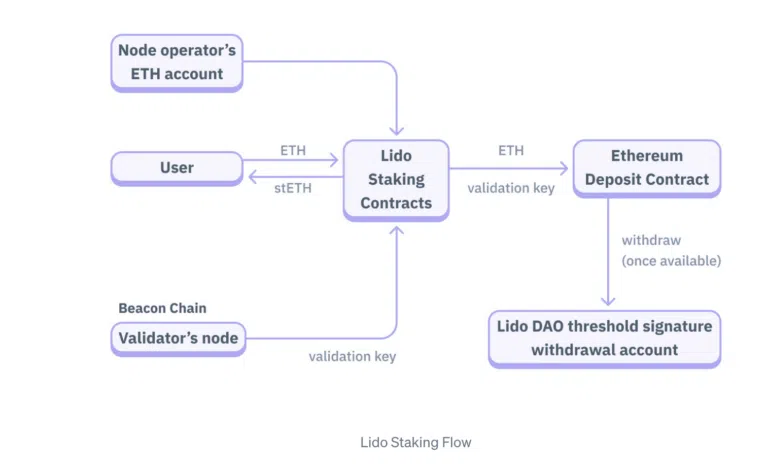 Une fois qu’un utilisateur place ses ETH en staking, les opérateurs de nœuds de Lido déplacent les pièces vers la Beacon Chain d’Ethereum 2.0. En contrepartie de leurs efforts, ces opérateurs gagnent des récompenses de staking, qui sont réparties entre les stakers ETH en fonction de leurs avoirs.