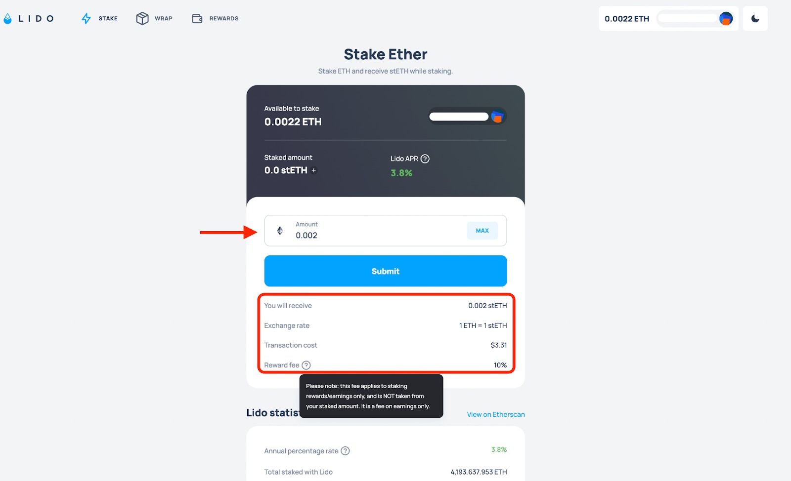 Afin de faire du staking Ethereum sur Lido, sélectionnez le montant d’ETH que vous souhaitez déposer, puis cliquez sur “Submit”. Notez que vous devrez conserver des ETH dans votre portefeuille pour pouvoir payer les frais de transaction.