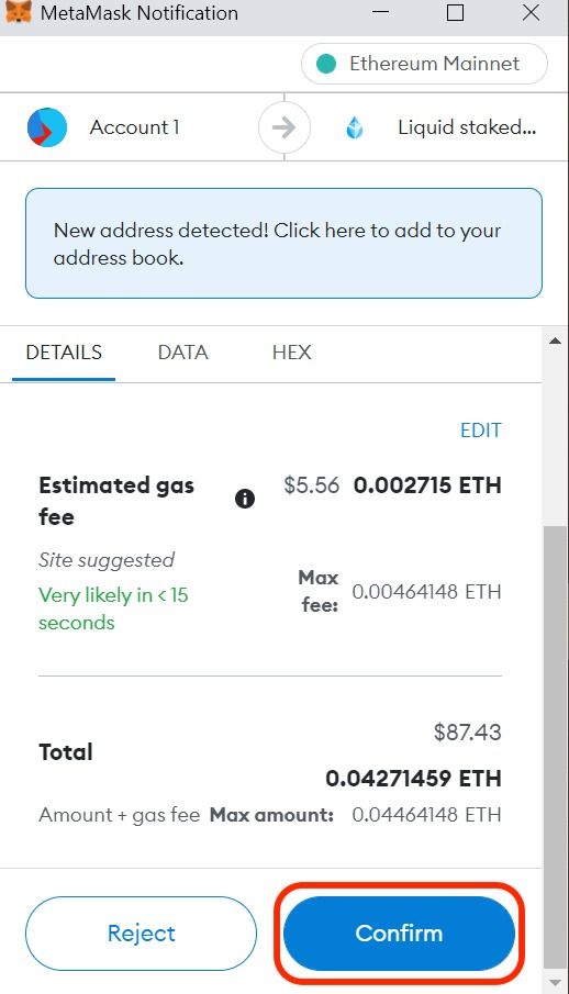 Ensuite, votre portefeuille vous demandera de confirmer la transaction. Pour cette démonstration, nous avons utilisé le wallet MetaMask. Nous allons donc vérifier tous les détails de la transaction, puis cliquer sur “Confirm”.
