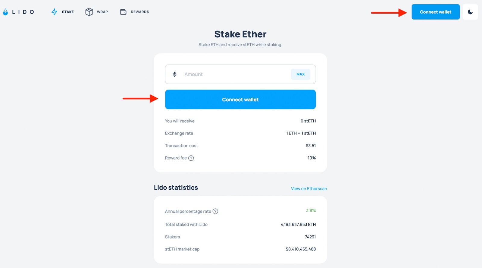 Rendez-vous sur le site officiel de Lido, puis connectez votre portefeuille à l’application du protocole. Pour ce faire, cliquez simplement sur le bouton “Connect Wallet” qui se trouve sous “Stake Ether” ou sur le bouton qui se trouve en haut à droite de votre écran.