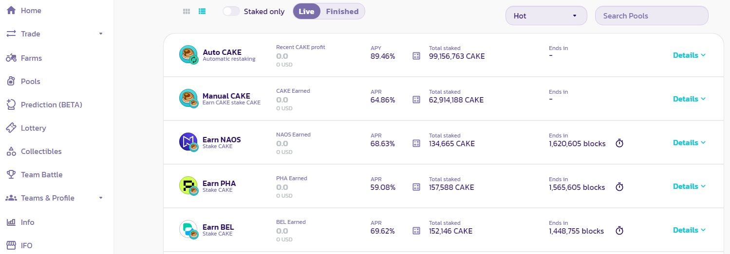 Afin de vous assurer de générer le maximum de bénéfices grâce au staking CAKE, consultez l’onglet “Farms” pour découvrir quel pool de liquidités est le meilleur pour le farming du token CAKE et qui offre le plus de tokens en récompense.