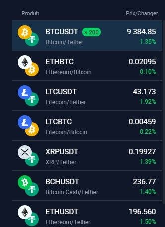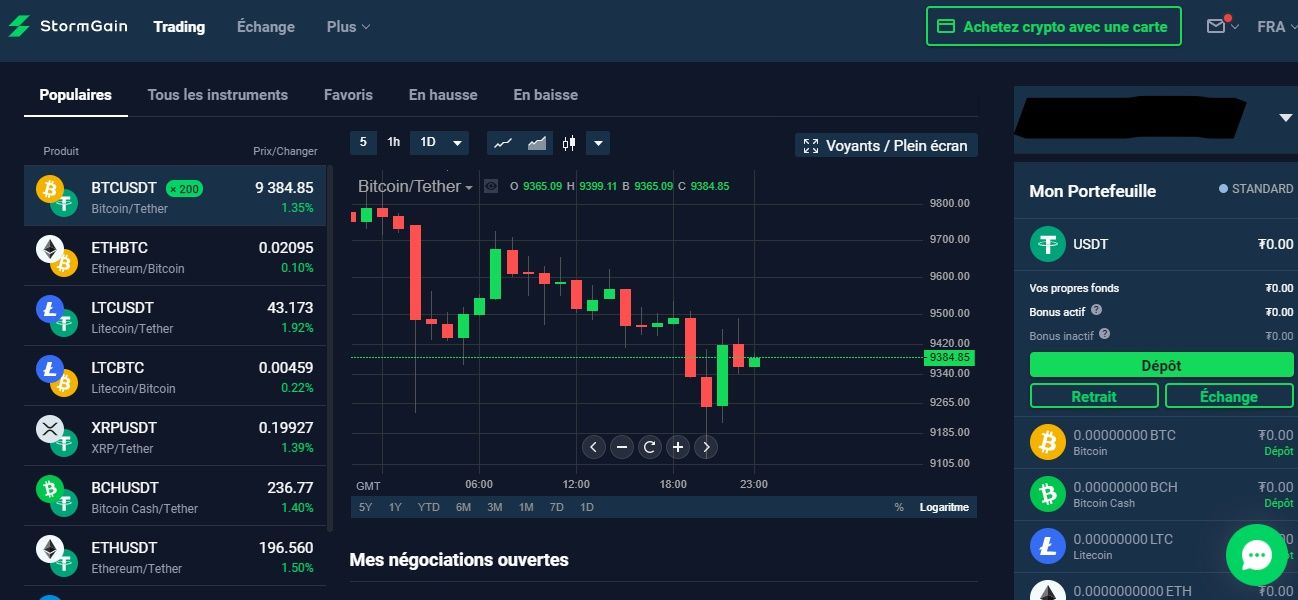 Les paires d’échange visibles sur la gauche sont en fait des raccourcis vers le marché indiqué. Stormgain bénéficie de nombreux actifs populaires en plus de Bitcoin, tels qu’Ethereum, le XRP de Ripple, Litecoin ou encore Dash, entre bien d’autres. Notez que des onglets vous permettent de classer les paires, et qu’en cliquant sur “Tous les instruments”, vous obtiendrez une liste de la totalité des actifs disponibles. Sachez également que toutes les paires qui y sont présentées seront associées soit au stablecoin Tether (USDT) soit à Bitcoin (BTC). Il est important de savoir quelle paire vous cherchez lorsque vous placez des ordres, et il vaudrait donc mieux vous familiariser avec ces dernières dès maintenant.