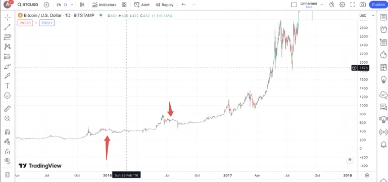 – Avant le halving : Début 2016, BTC se négociait à environ 420 $. Mais en juillet, soit seulement quelques jours avant le halving, son cours a dépassé les 680 $. La période de référence est de six mois.