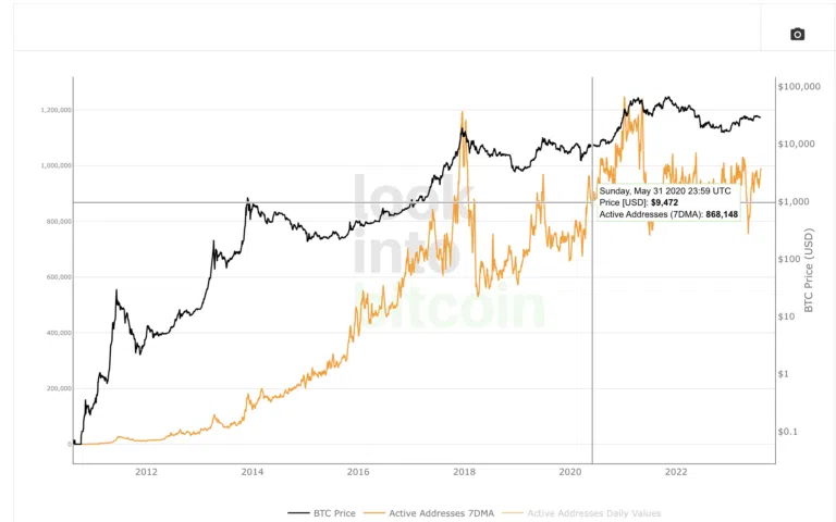 Cet indicateur représente le nombre d’adresses uniques effectuant des transactions sur le réseau Bitcoin au cours d’une période spécifique. Il permet de mesurer l’activité on-chain et de jauger l’intérêt et le sentiment des investisseurs.
