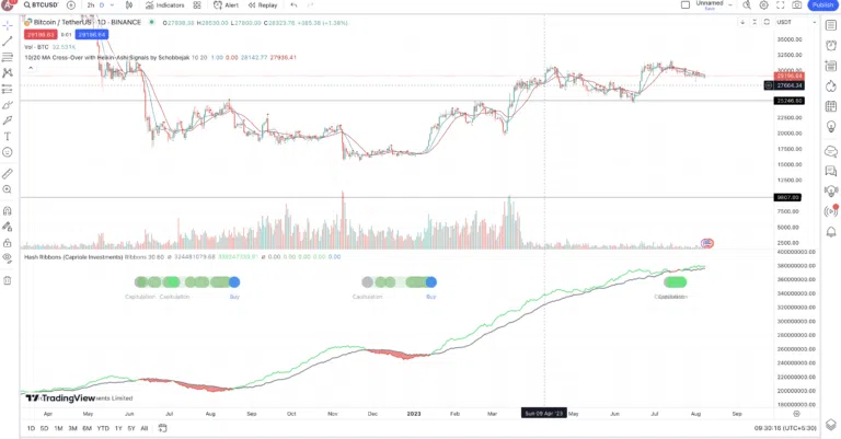 La meilleure stratégie d’investissement consiste à attendre une augmentation des revenus de minage avant d’ouvrir votre position. De même, nous vous conseillons de surveiller les rubans de hachage pour localiser le point final de la phase de capitulation. Une fois la phase de capitulation terminée, vous pouvez utiliser d’autres outils d’analyse technique pour déterminer le meilleur moment d’acheter Bitcoin ou d’investir dans les crypto-monnaies alternatives (altcoins).