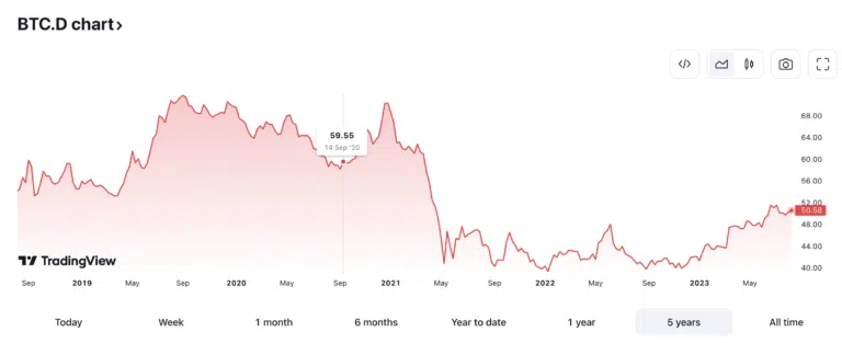 Il convient de noter qu’il existe mille et une façons d’interpréter le graphique de dominance Bitcoin. Lorsque le taux de dominance augmente pendant un marché haussier, il est recommandé de préférer Bitcoin aux altcoins. Cependant, si, malgré la hausse du cours BTC, son taux de dominance diminue, vous ferez mieux d’investir dans d’autres crypto-monnaies.