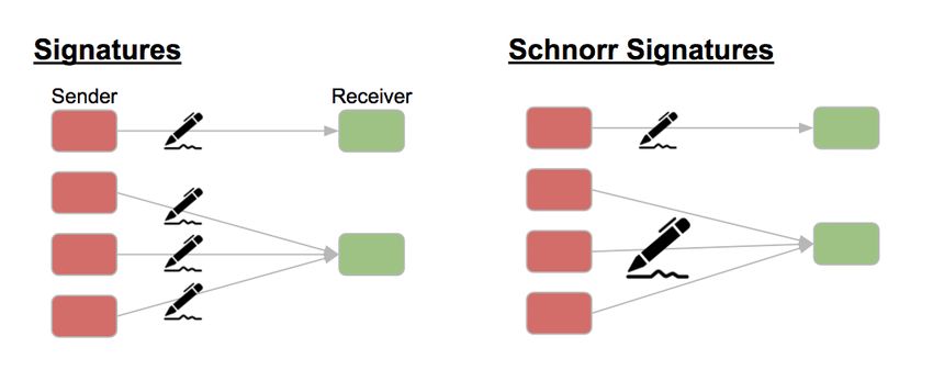 Comme leur nom l’indique, les signatures Schnorr permettent à plusieurs clés de participer à une transaction, et à une signature de les valider. Ainsi, si plusieurs parties participent à une transaction, la signature Schnorr camoufle leur implication et apparaît comme une seule transaction. De plus, en termes de taille d’octet, les signatures Schnorr sont plus petites que les signatures et les clés traditionnelles de Bitcoin, ce qui signifie que les utilisateurs économisent sur les frais de transaction et peuvent faire tenir plus de données dans un bloc. Cela donnera lieu à des signatures plus petites, des validations de blocs plus rapides et, globalement, plus de transactions par seconde.