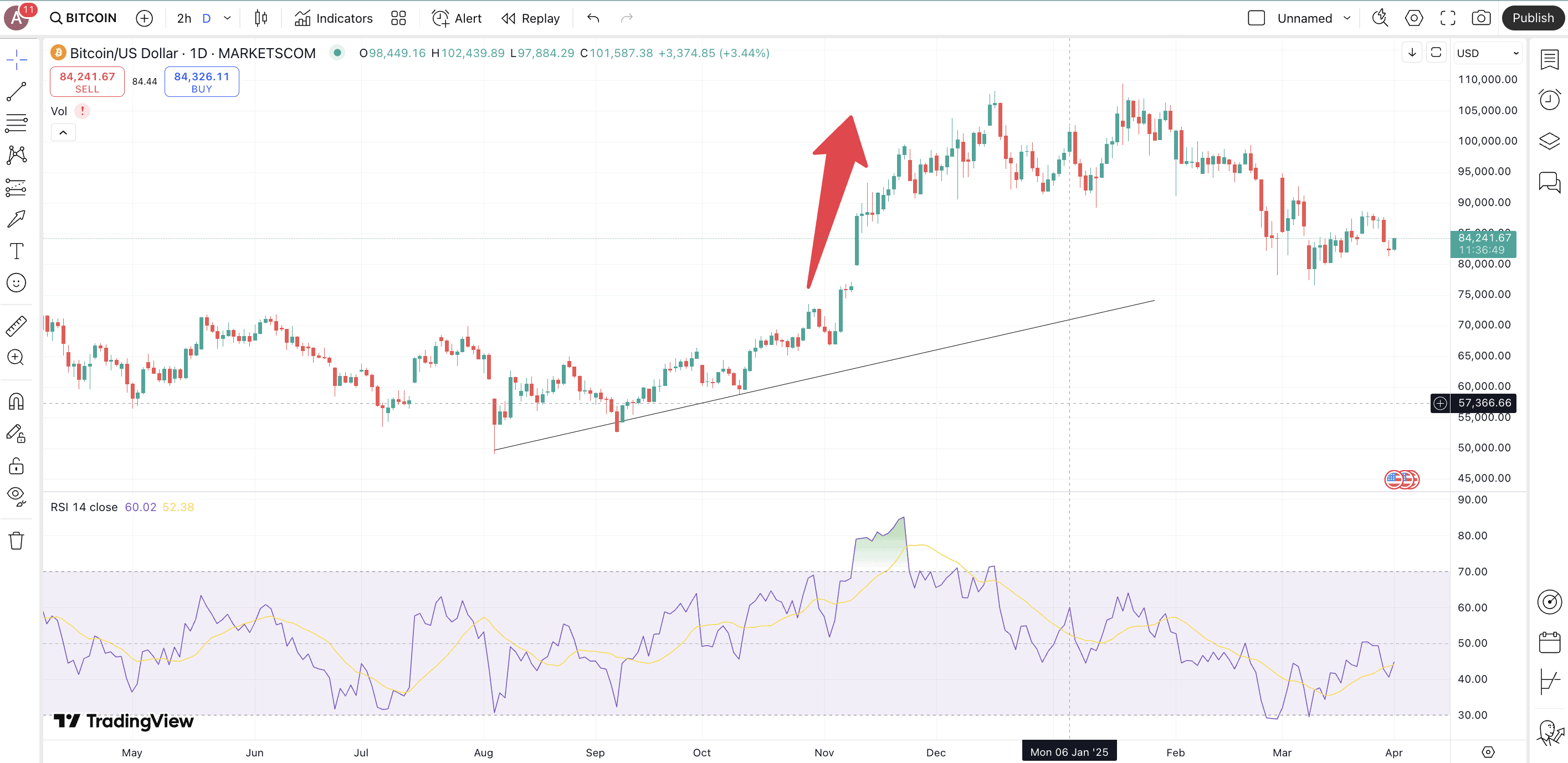 - Conditions de surachat du RSI : Lorsque le RSI est au-dessus de 70, Bitcoin peut être surévalué.
