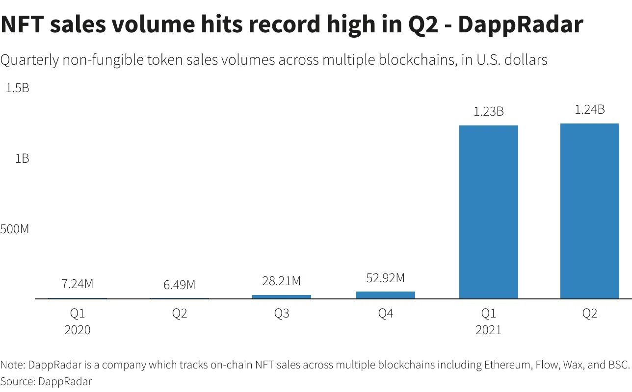 À en croire les données de DappRadar, les ventes de NFT ont totalisé 2,47 milliards de dollars au premier semestre 2021. De son côté, la plateforme NonFungible.com estime ce volume à 1,3 milliard de dollars. Mais peu importe les différences entre ces chiffres ; ils dépassent 1 milliard de dollars, ce qui constitue une croissance significative par rapport à l’année précédente. Selon Cloudwards, les ventes de NFT en 2020 n’ont totalisé “que” 250 millions de dollars.