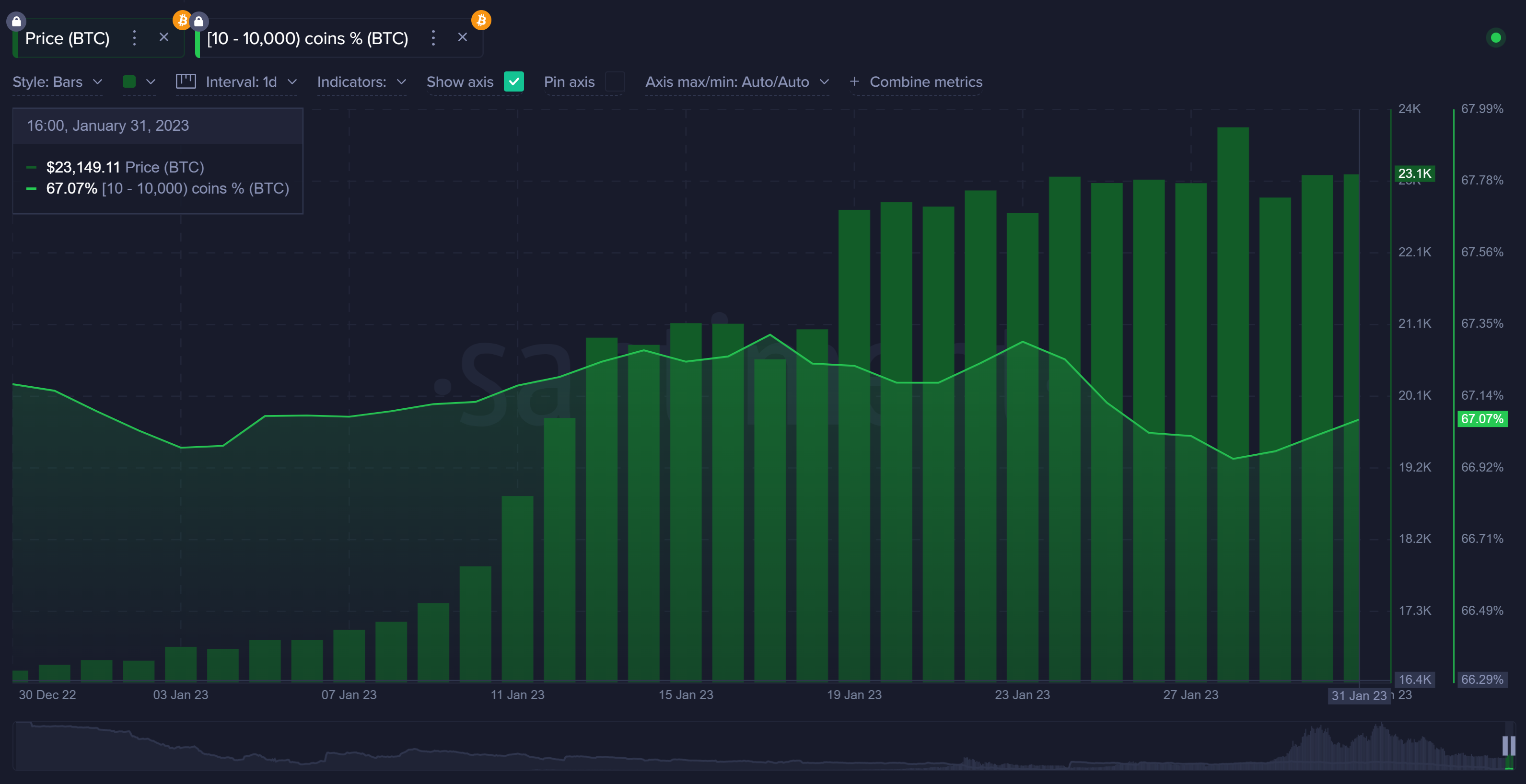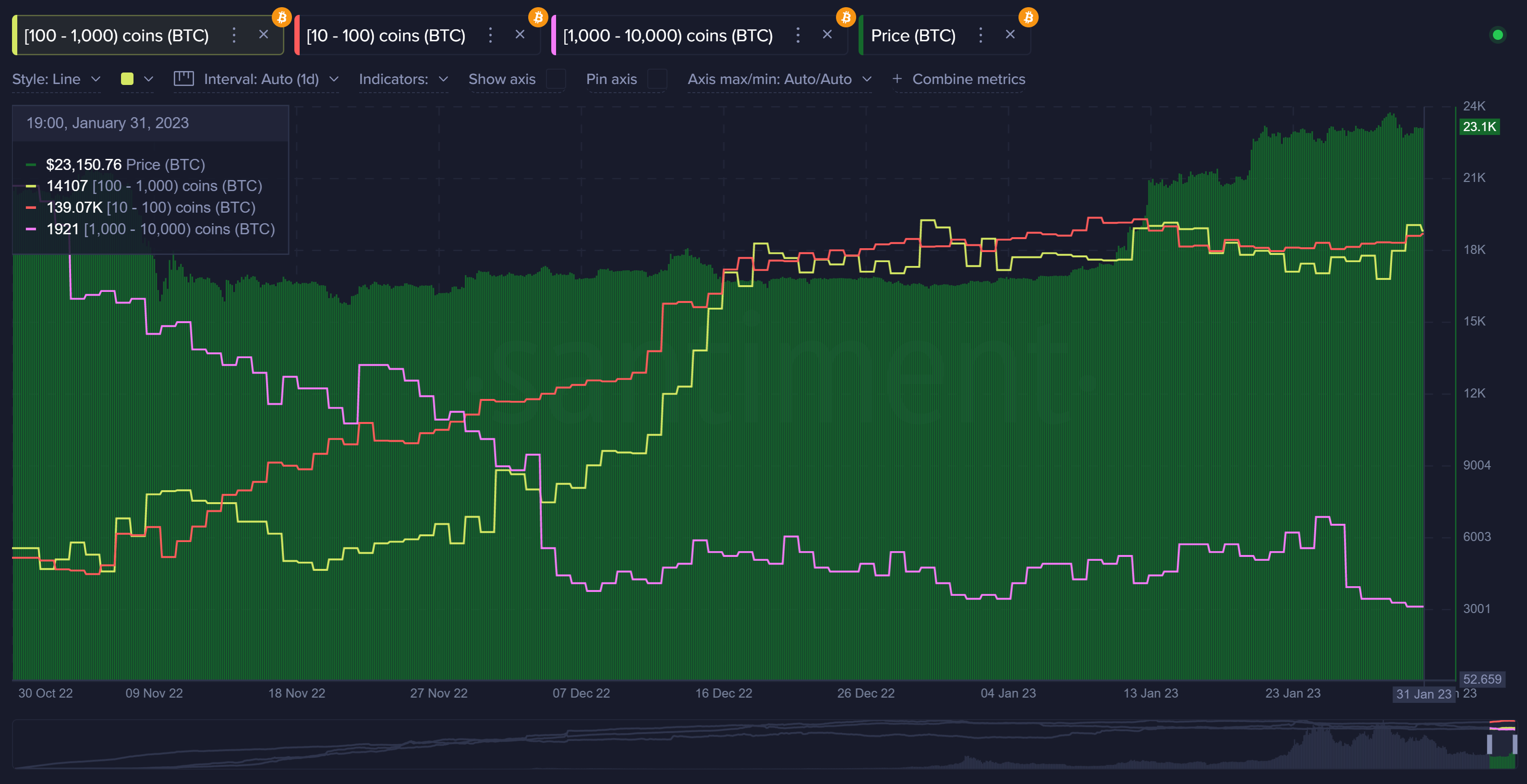 - Les adresses détenant 10-100 BTC (rouge) ont progressé jusqu’à la fin décembre. Mais elles ont stagné au cours du dernier mois.