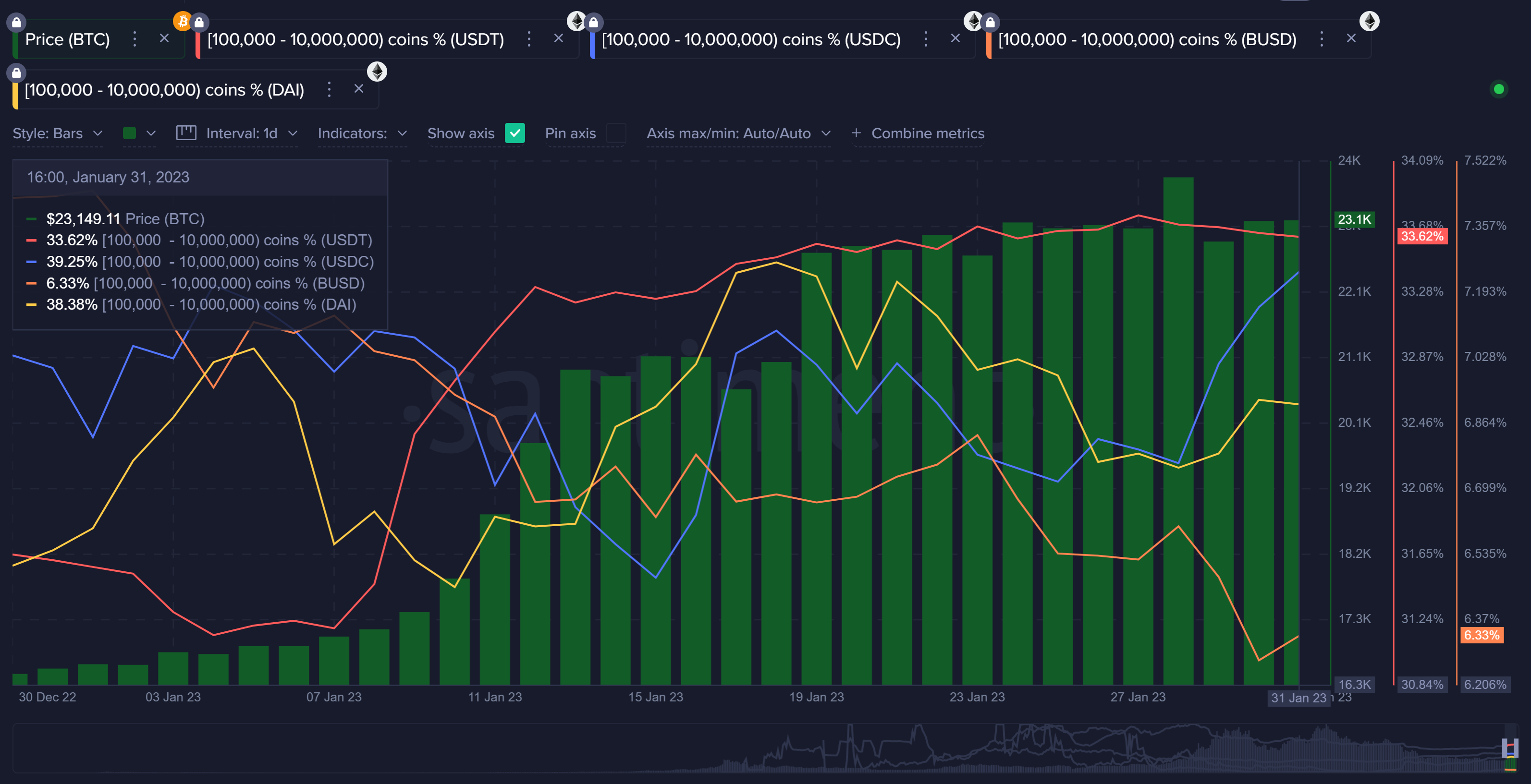 - Sur l’USDC, le pourcentage a varié tout au long du mois de janvier avant qu’une poussée tardive au cours des 3 derniers jours semble indiquer que les requins et les baleines continuent de stocker des stablecoins, augmentant leur pouvoir d’achat.