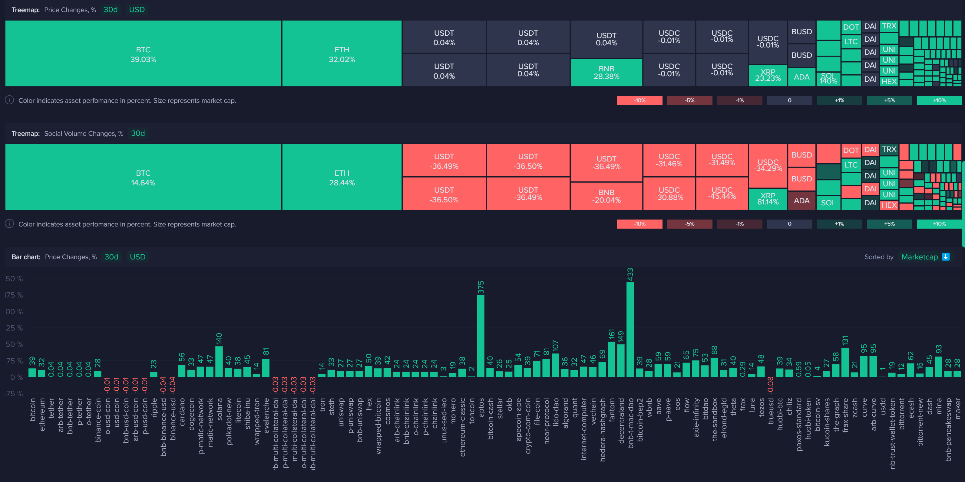 Avec toutes les envolées de prix dans le paysage crypto, il n’est pas surprenant de retrouver les altcoins en première ligne. Par conséquent, il est encore difficile d’évaluer la santé du marché des cryptomonnaies. Actuellement, ₿ Bitcoin n’est pas forcément dominant, avec une Social Dominance de 20 % :