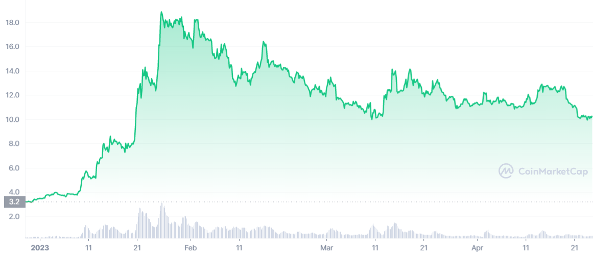 Après avoir été lancée en plein bear market, la crypto Aptos a rapidement connue l’euphorie et la désillusion en traversant une des phases les plus dures du bear market. Si l’on met de côté le lancement initial, le bottom sur le cours APT a été atteint le 29 décembre 2022. En même temps que plusieurs autres cryptomonnaies. L’espace d’une journée, le jeton s’est échangé à 3,08 $ avant de remonter progressivement la pente.