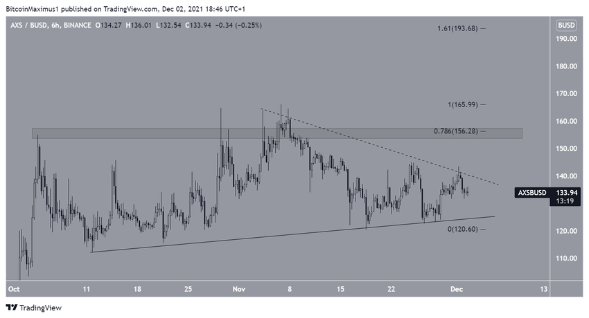 Depuis le 18 octobre, le token AXS se négocie dans une fourchette de prix comprise entre 110 et 160 dollars. Il semble que ce mouvement soit contenu à l’intérieur d’un canal parallèle ascendant. Le 6 novembre, l’AXS a été rejeté par la ligne de résistance du canal (flèche rouge) et a ensuite décliné.
