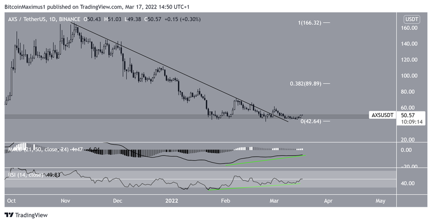 Au départ, il semblait que ce mouvement de baisse avait entraîné un passage du cours sous la zone de support horizontale de 45-50 $, laquelle était en place depuis août 2021. Cependant, AXS a rapidement inversé sa tendance et a dépassé sa ligne de résistance descendante le 28 février.
