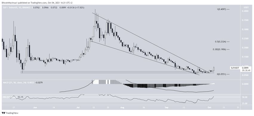 Le cours du SLP diminuait à l’intérieur d’un biseau descendant depuis son sommet record de 0,41 $ le 13 juillet. Le mouvement à la baisse s’est poursuivi jusqu’à un creux de 0,055 $ le 21 septembre.