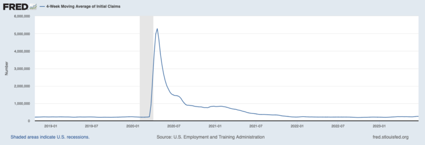 Le ministère américain du travail publie chaque semaine les demandes d’allocations de chômage pour indiquer le nombre de nouvelles personnes qui en font la demande. Toutefois, ce chiffre peut être très volatil. C’est pourquoi les acteurs financiers considèrent souvent la moyenne sur quatre semaines comme le reflet le plus fidèle du marché de l’emploi américain.