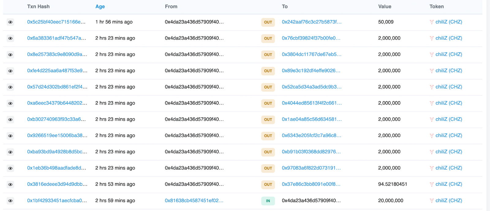 Tout d’abord, la baleine a transféré 20 millions de CHZ vers l’adresse 0x4da2. Ensuite, 0x4da2 a envoyé plus de 18 millions de CHZ vers plusieurs adresses dans plusieurs transactions de 2 millions de CHZ chacune.