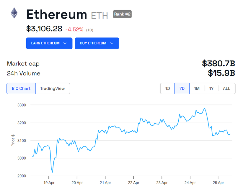 Contrairement à ces indicateurs techniques optimistes, la réaction immédiate du marché a été moins favorable. En effet, le cours d’Ethereum a récemment chuté à 3 106 $, marquant une baisse de 4,52 % dans la journée.