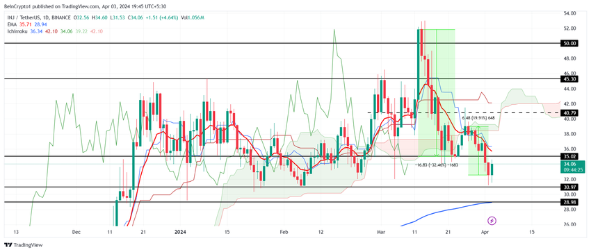 Injective (INJ) tente de se redresser après être tombé sous le niveau de support de 35 $. Cela marque également un plus bas mensuel pour le jeton.