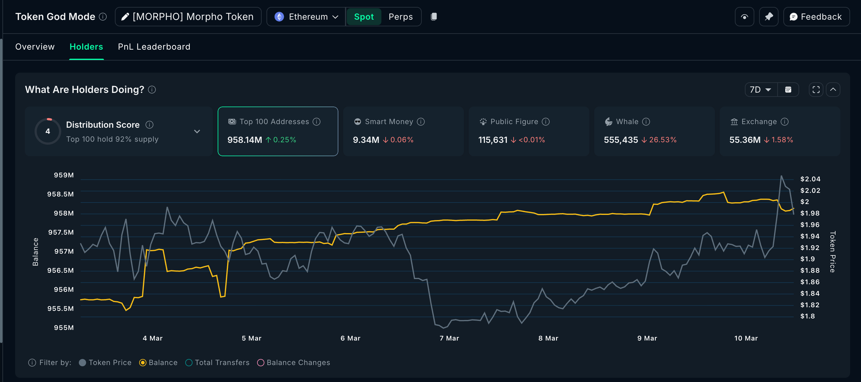 Morpho (MORPHO) montre un positionnement contrasté des baleines avant l’IPC. Leurs avoirs ont chuté de 26,53 % à 555 435 tokens sur 7 jours, les gros porteurs prenant leurs profits après un rallye de 100 % depuis le 6 février.
