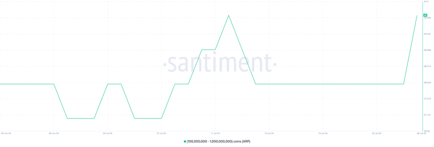 Ensuite, parmi les altcoins privilégiés, nous retrouvons XRP de Ripple, qui a récemment bénéficié de la confiance renouvelée du marché. Selon Santiment, le nombre d’adresses détenant entre 100 millions et 1 milliard de jetons a augmenté depuis le 23 juillet.
