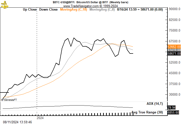 Dans ce climat, le trader vétéran Peter Brandt a souligné que Bitcoin pourrait avoir subi un changement de tendance, passant d’une dynamique haussière à baissière. L’analyste a identifié une “death cross” sur le graphique hebdomadaire entre les moyennes mobiles simples de 8 et 19 (SMA).