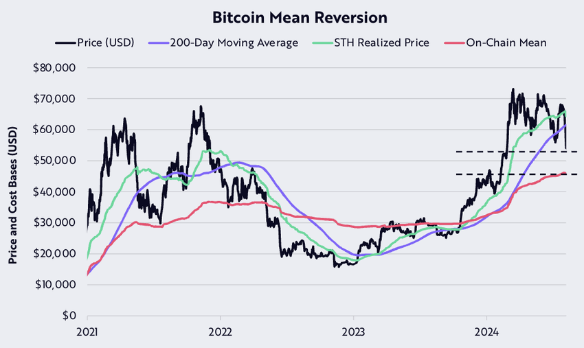 « Les seuils de support clés pour Bitcoin se situent à 52 000 $ et 46 000 $, ce dernier étant confirmé par sa moyenne on-chain, la ligne rouge visible sur le graphique », a précisé Puell.