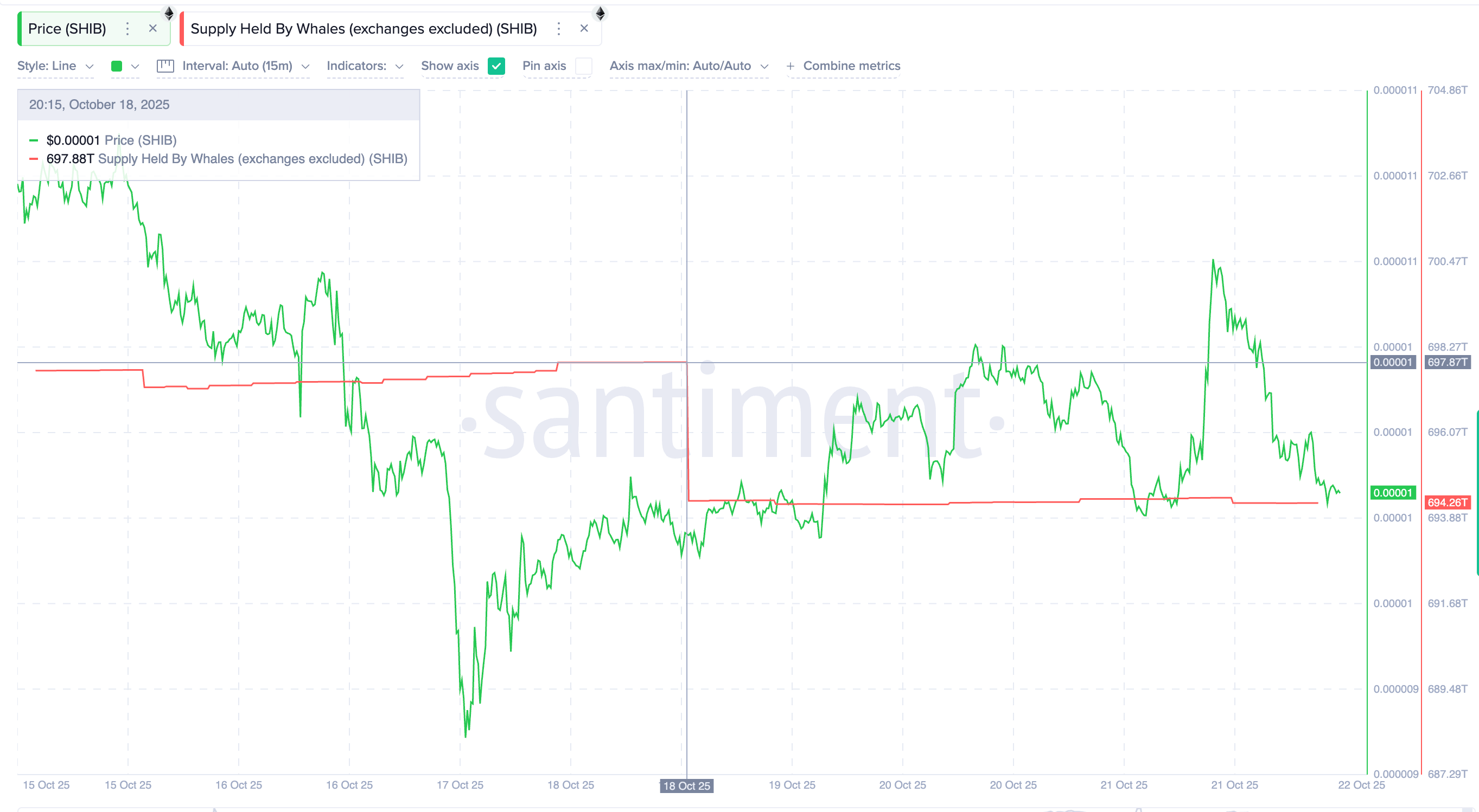 Les détenteurs de Shiba Inu semblent se détourner du célèbre meme coin… pour le remplacer par d’autres. Les portefeuilles majeurs ont réduit leurs avoirs de plus de 3,62 billions de SHIB, passant de 697,88 à 694,26 billions de jetons, soit environ 355 000 $ au prix actuel de 0,0000098 $, d’après Santiment.