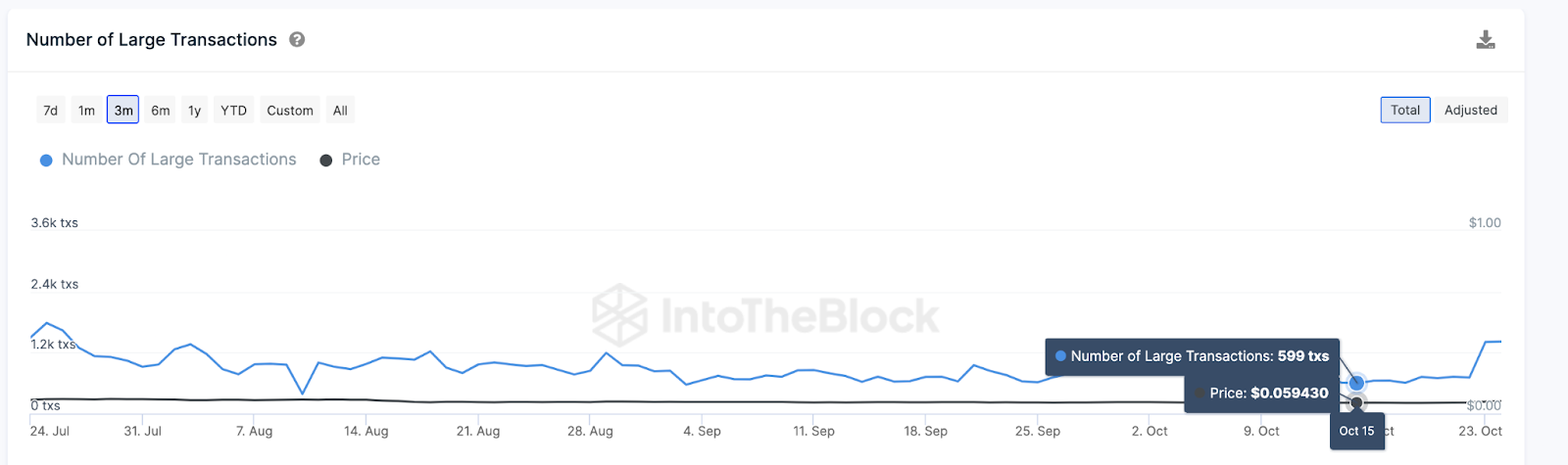 Comme le montre le graphique ci-dessous, alors que le prix du DOGE était au plus bas depuis un an, la blockchain a enregistré 599 transactions de baleines crypto le 15 octobre.