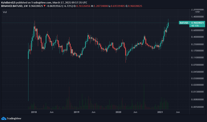Basic Attention Token (BAT) a atteint un nouveau sommet historique de 1,20$ le 17 mars. Il a légèrement retracé depuis cette avancée, mais il oscille toujours autour de 1$.